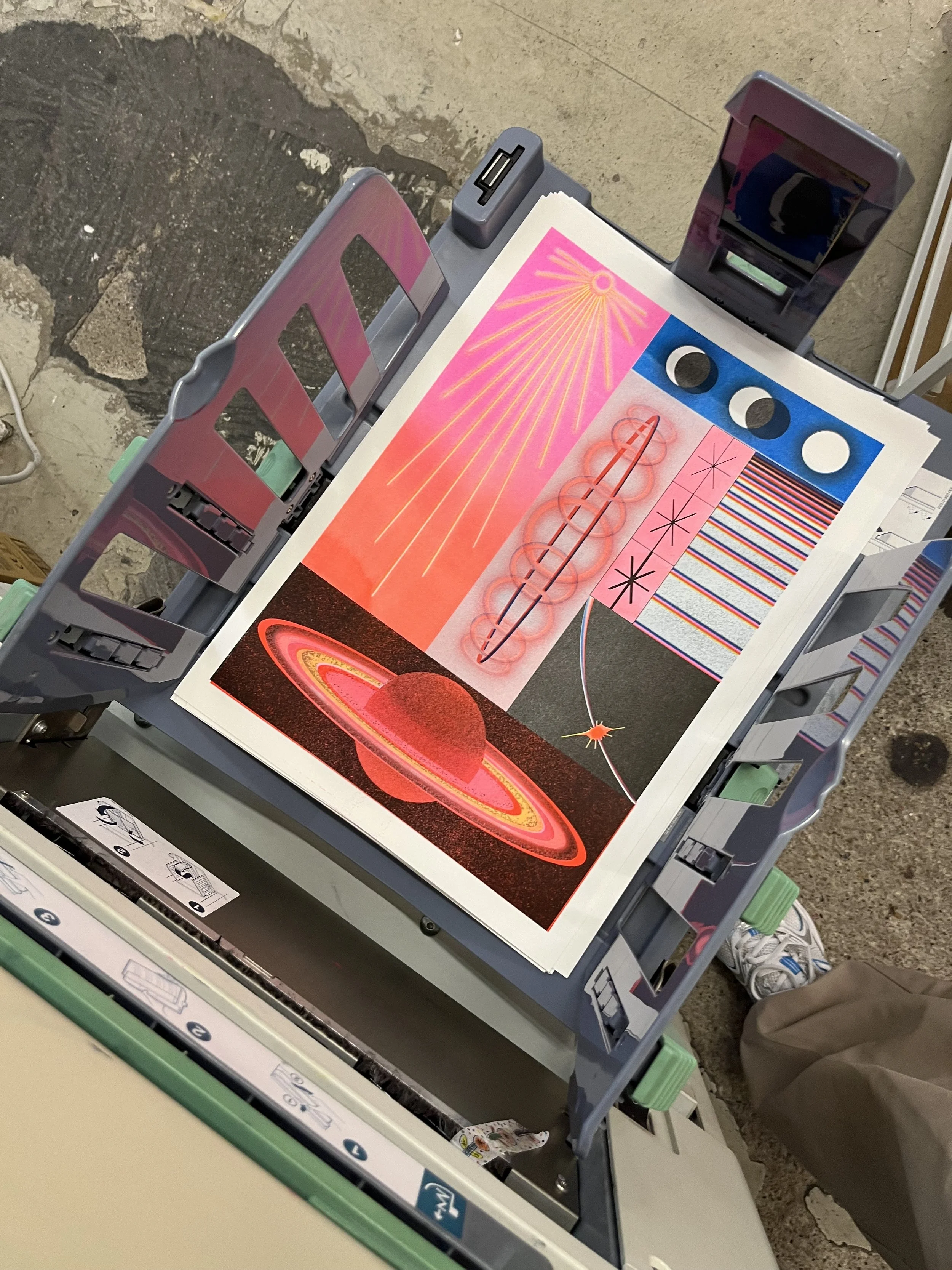 With a background in art and graphic design, I was always drawn to print. But it wasn’t until I moved to Berlin that I discovered risography and fell in love with its unexpected outcomes and the slow pace production process behind it. After taking a couple of workshops, I starting working with it until fully committing to the craft. Ever since, I’ve been exploring and expanding its language, embracing its limitations as part of my creative journey. My riso motto: In your limitations, I expand.